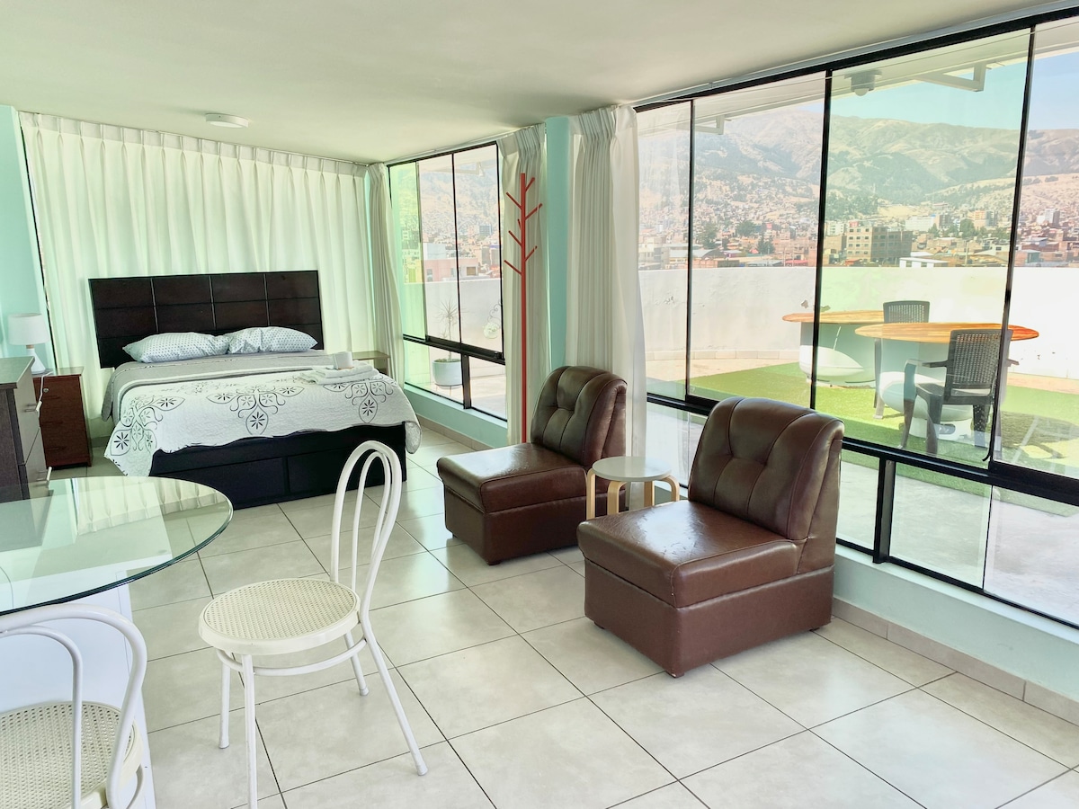 Ilus stuudio, kust avaneb imeline vaade Huancayo maastikule ja linnale. Selle peatumine 6. korrusel. Lähedal (kuni 2 kvartalit) traditsioonilisele tänavaturule, supermarketile (Plaza Vea), pankadele, kaubanduskeskustele, peabussijaamale (terminal Los Andes), ühistranspordile kõikjale! Saad nautida seda privaatset stuudiokorterit, mida jagad sõbraga, kõigi põhimajutuskohtade, sooja vee, WiFi ja tasuta parkimisega. Kui soovid veeta hämmastava puhkuse või ärireisi Huancayos, on see sinu parim valik.