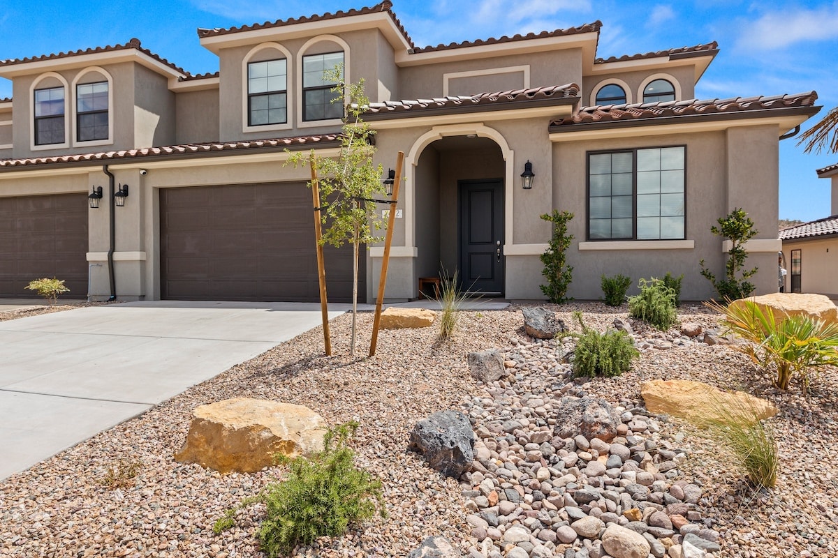 Experience the best of Southern Utah from the comfort of this townhome. Copper Cove's modern cozy 2600 sq ft boast 5 beds and 5 baths with first floor master and living space are perfect for those who don't do stairs. EV-ready. The 3 king suites, second living room, and chef stocked kitchen will entertain a crowd of all ages. Hang out at our lazy river, pool, hot tub, splash pad, or play pickle ball with the whole family. Centrally located to Zion, St. George, and championship golf courses.