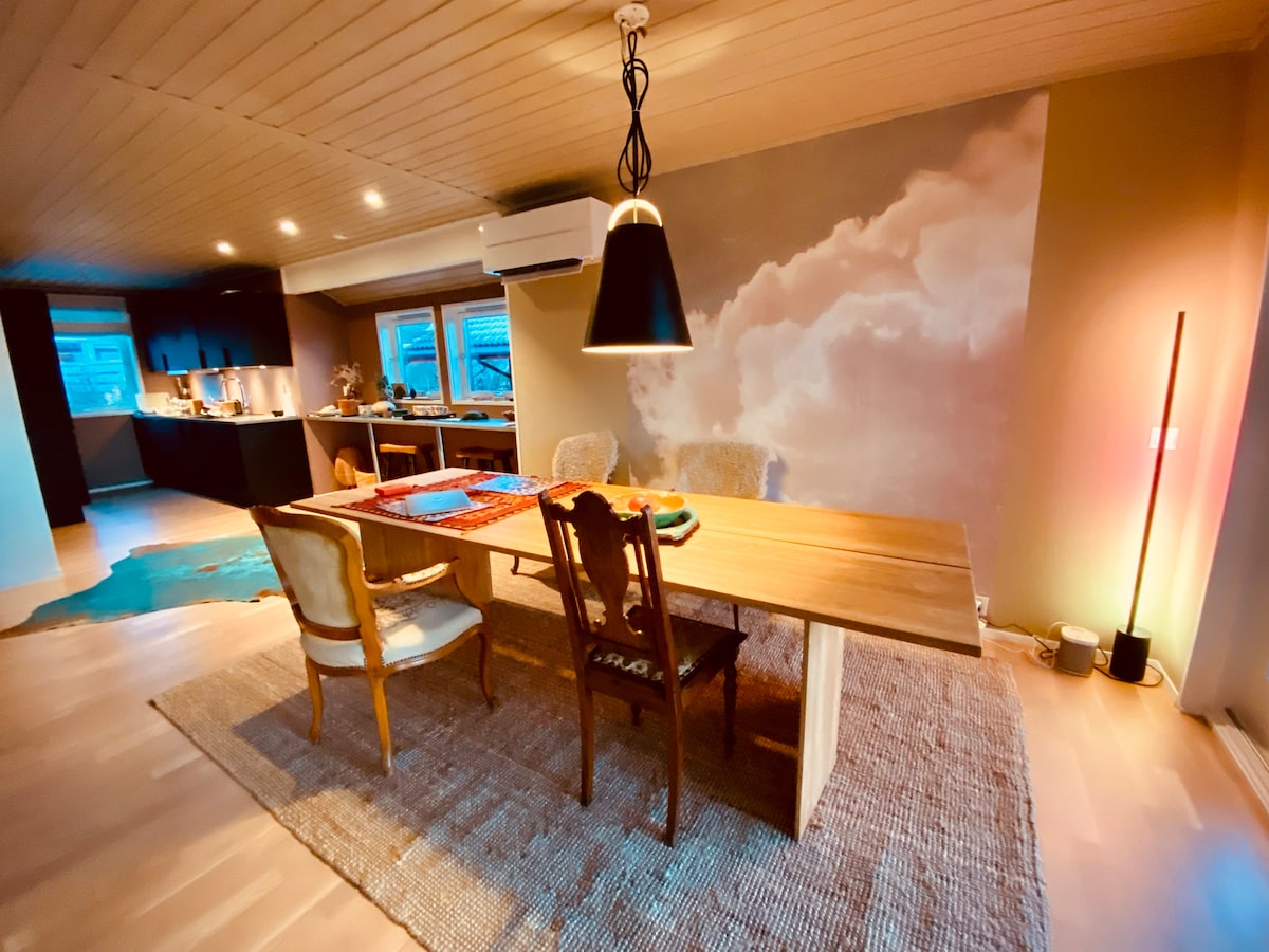 Ilus kahekorruseline korter esimese rea vaatega kanalile (Karmsundet) väljast privaatselt rõdult. Asub vaikses naabruskonnas, kus on jalutuskäigu kaugusel Haugesundi kesklinnast. Korterit uuendatakse hiljuti rahulike roheliste värvide ja originaalse retro mööbliga. Uus 50-tolline nutiteler (sh wifi), uus pesumasin ja kuivati on sisse pandud. Hästi varustatud nõudepesumasina, mikrolaineahju, rösteri ja kingakuivatiga. Sinu vaikuse leiad siit.