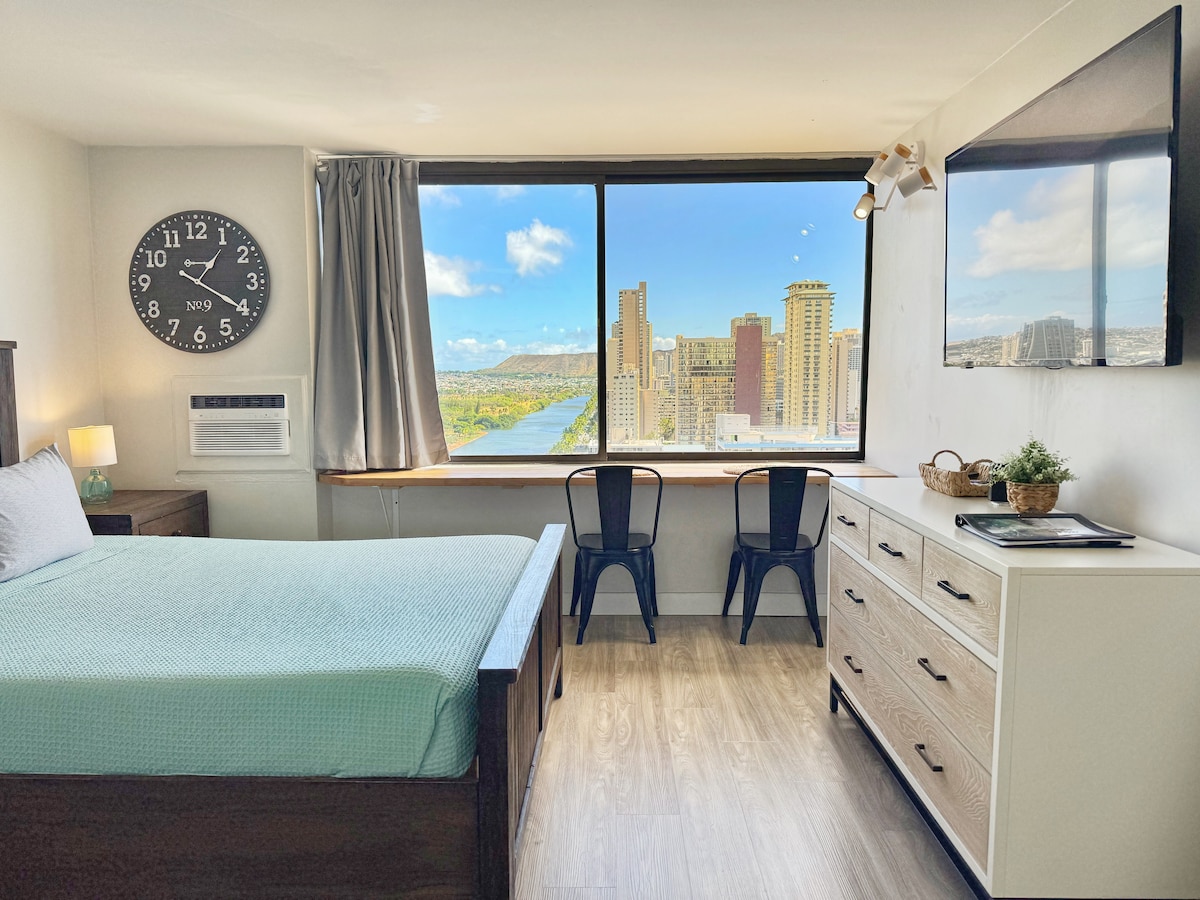 Your dream Waikiki getaway begins here! Enjoy panoramic views from our 26th-floor studio in the Hawaiian Monarch, featuring a king bed and views of the ocean, canal, and Diamond Head. The condo is remodeled with new amenities, including a kitchen, A/C, WiFi, and a flat-screen smart TV. After a day exploring O'ahu, unwind in comfort with ocean, sunset, and sunrise views. Just a short walk to the beach, shopping, restaurants, and more—this is your perfect vacation, and we can’t wait to host you!