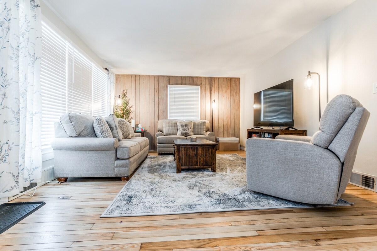 A modern cabin on a half-acre with a refined rustic element. There are lots of amenities like a gas grill, arcade games, corn-hole, and more. Many people in our area would call this their “camp,” a place to sit by a campfire or curl up on the couch for a nap. The cabin has three bedrooms, a fully operational kitchen, and a full bathroom. In the winter you might need a AWD vehicle to reach the cabin because of the snow. Ask about walking access to the creek for April -August trout fishing