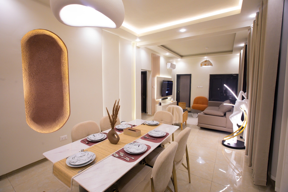 This private 2-bedroom apartment is situated on the left wing of a larger home. Each bedroom features a 2 beds,and guests have their own private bathroom. The living area includes a TV and air-conditioning for comfort. A shared kitchen is available for cooking simple meals. Guests can also enjoy secure parking, a calm outdoor setting with a fountain, and refreshing lake view.The apartment provides a quiet and modern stay ideal for relaxation, work trips, or weekend getaways.