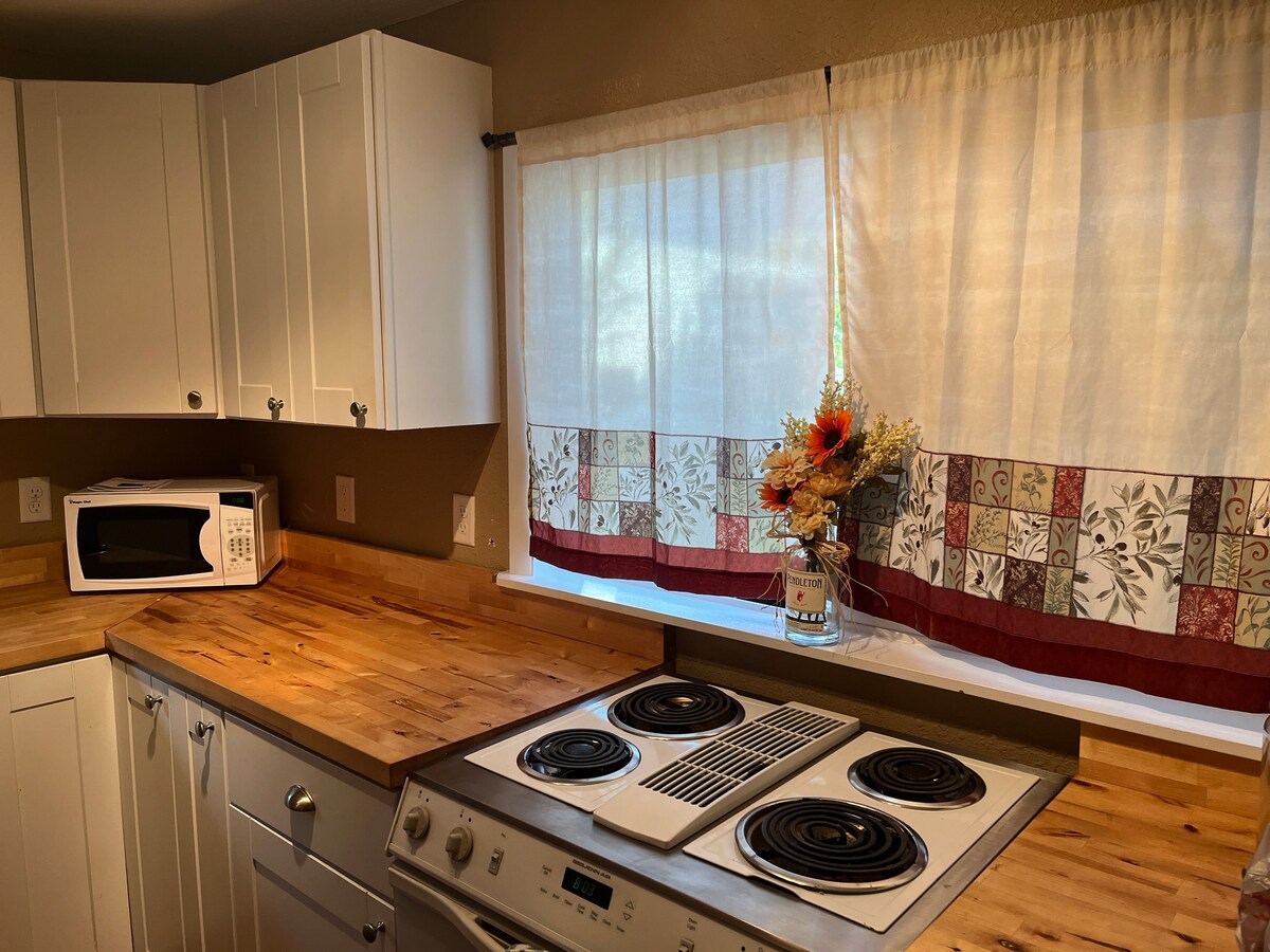 Welcome to our charming ranch house featuring 3 bedrooms, 2 baths (including a main bedroom king sized bed and ensuite), and a fully equipped kitchen for family meals. Relax in the spacious living and dining area, or work from the desk in the guest bedroom. Stay warm in the winter and cool in the summer with A/C, and enjoy convenience with a laundry room. Perfect for both work and leisure stays!
