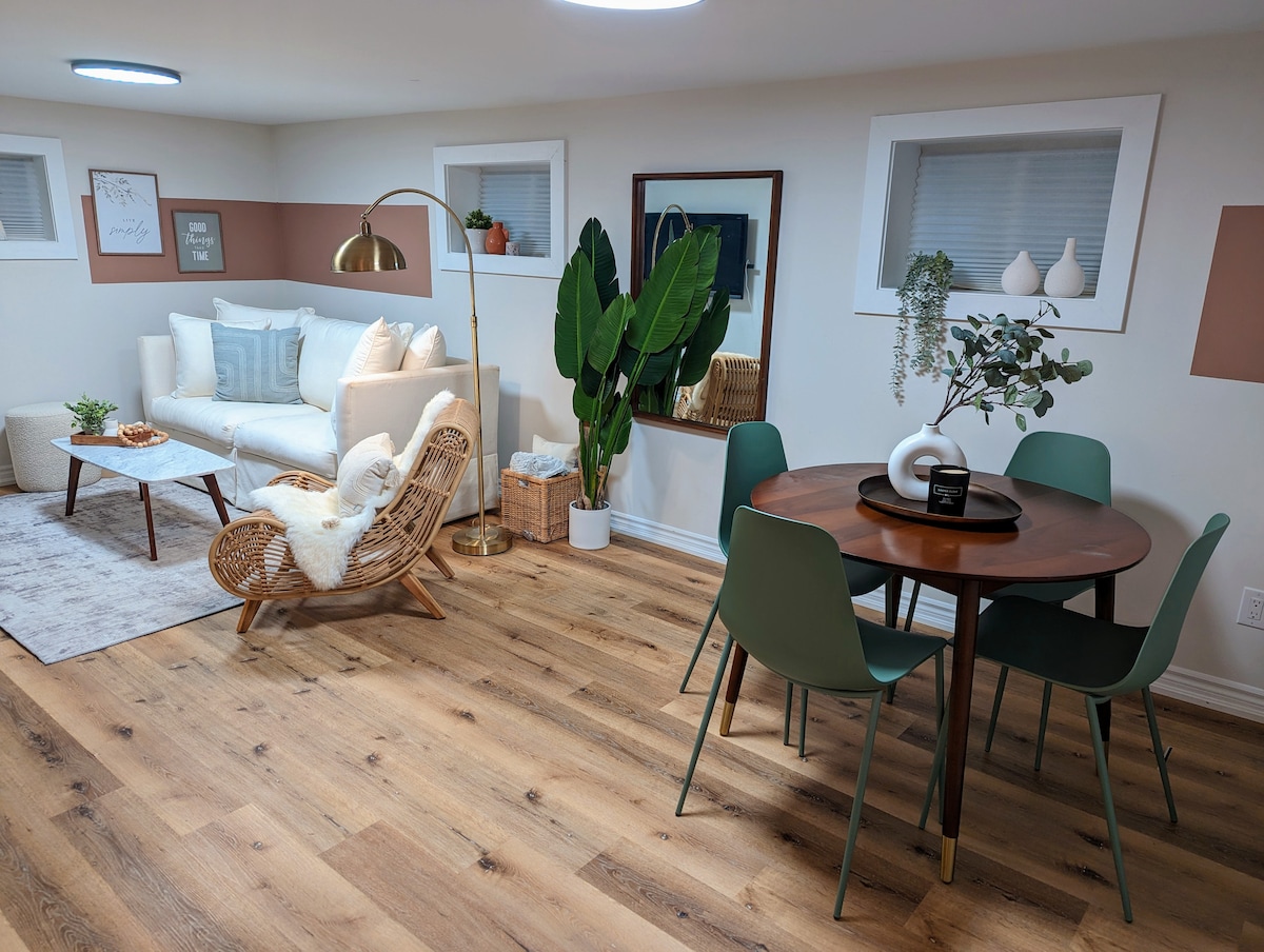 Avar alumise korruse seaduslik keldrikorter avatud kontseptsiooniga elutoa ja köögiga. 2 kaheinimesevoodit ja 1 diivanvoodi. 401 lähedal asuvad toidupoed, restoranid, kaubanduskeskused, kasiinod, pargid, Toronto loomaaed ja 5-minutilise autosõidu kaugusel GO Trainist. 1 sõiduki parkimine. Elektriauto maksab 10 dollarit päevas Lisakülalised 25 $/päev. Eraldi sissepääs iseseisvaks sisseregistreerimiseks koos pääsukoodiga. ✅ WiFi, iMac ja printer ✅ Teleriboks Netflixi/Amazon Prime 'iga Lauamängude ✅mitmekesisus ✅ Täisköök maitseainetega