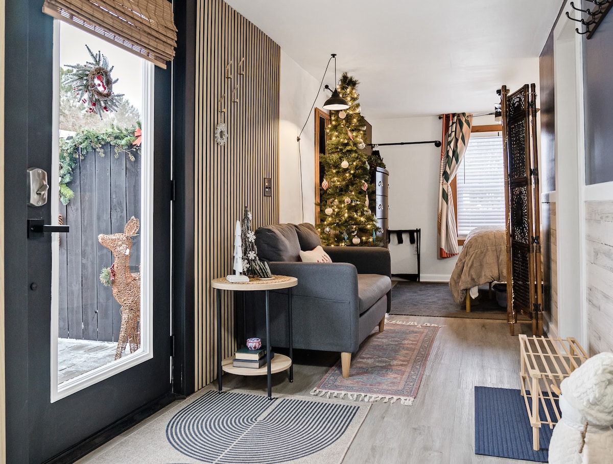 Everything you need to relax & recharge in one cozy space. Private entrance. This suite is an open floor plan with a small kitchenette that includes a fridge, microwave and stove with basic kitchen utensils and dishes. It is located in town close to stores, restaurants. Nice patio out back with covered area to grill out. Walking distance to the North Country Trail and 10 min from the new Dragon trail. There is one queen bed and a couch. It will comfortably sleep two guest.