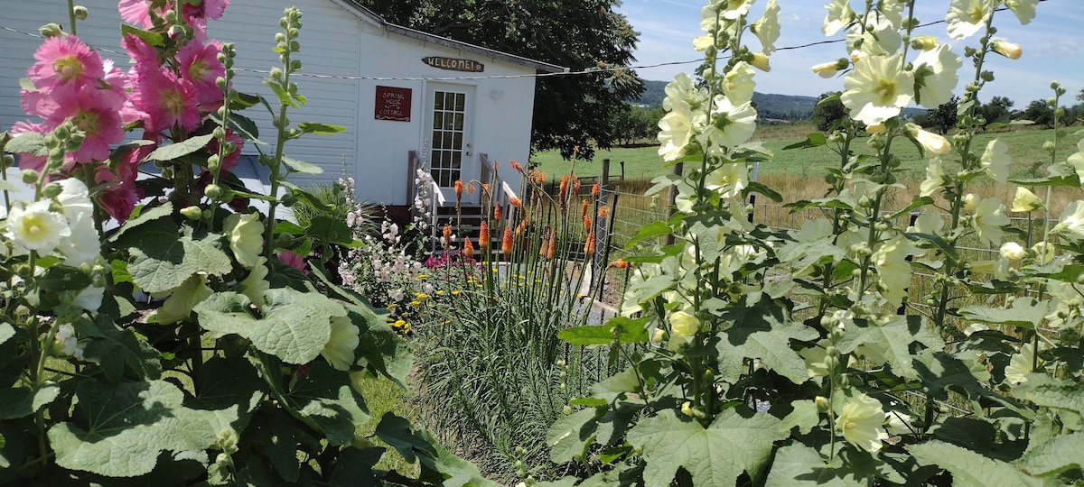 Farm Stay, escape to the country. Updated historic cottage is in a quiet country setting in the heart of the Shenandoah Valley, rural yet not remote. Enjoy a time of peaceful renewal. Relax overlooking the pastures and beautiful garden common space in the backyard retreat including a hot tub. Studio apartment with queen bed and additional futon sofa. Kitchenette is equipped with refrigerator, microwave, coffeemaker and dishes. Breakfast includes muffins, granola, and coffee.