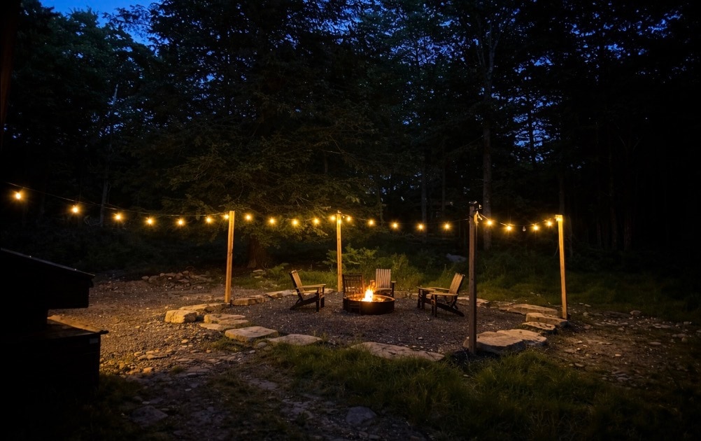 Ilus VAADE JÄRVELE KÜMBLUSTÜNNIGA, lõkkekoht ja mängutuba