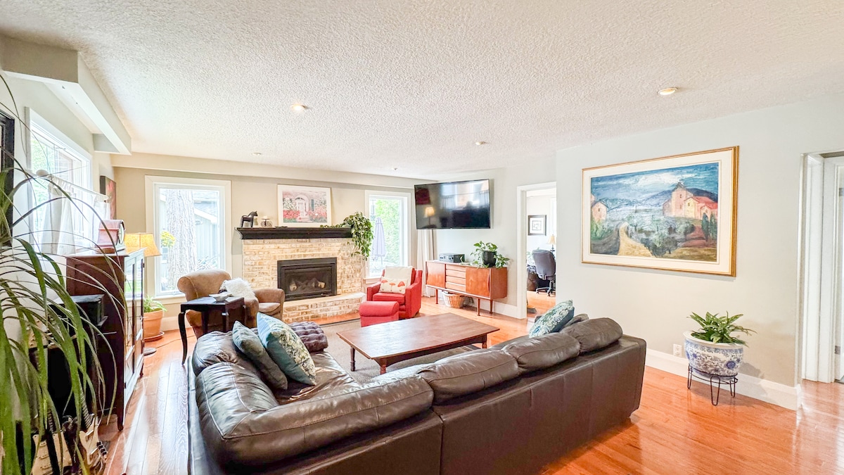 Tere! Meie 3 magamistoa ja 2 vannitoaga majutuskoht asub kesksel kohal madala liiklusega väljakul. Ruumikas, puhas ja valgusküllane! Sisaldab suurt peretuba kõrgete lagedega ja puuküttega kamin. Täielikult renoveeritud puitpõrandatega. Suur päikesepaisteline läänepoolne tagahoov ja 6 autoparklat sissesõiduteel. Naudi paljusid ainulaadseid mugavusi, nagu meie kromoteraapia aurusaun ja Brasiilia võrkkiik. Jalutuskäigu kaugusel plaadist, restoranidest ja parkidest. Mugav majutuskoht väljaspool kodu!