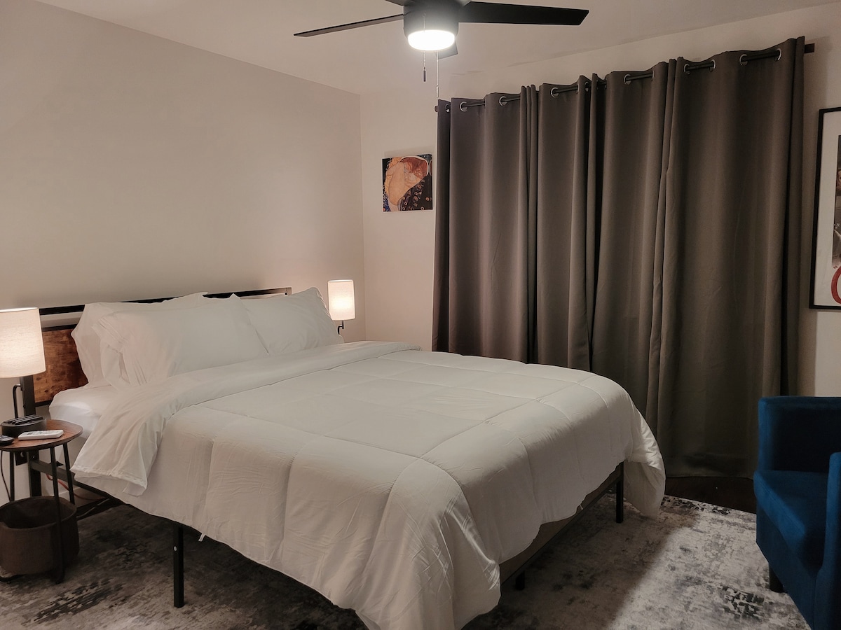 Tere tulemast oma majutuskohta väljaspool kodu! Selles mugavas teise korruse ühe magamistoaga korteris on privaatne vannituba, hubane elutuba lõõgastumiseks ja kohv, teejaam, mis sobib ideaalselt hommikuse tassi nautimiseks. Leiad ka mikrolaineahju ja rösteri hõlpsaks einestamiseks või suupisteteks peatumise ajal. Elutoas on 55-tolline teler, mis sobib ideaalselt voogedastamiseks või filmiõhtu nautimiseks. Magamistoas on mugav lai kaheinimesevoodi kvaliteetse voodipesuga, mis tagab rahuliku öise magamise