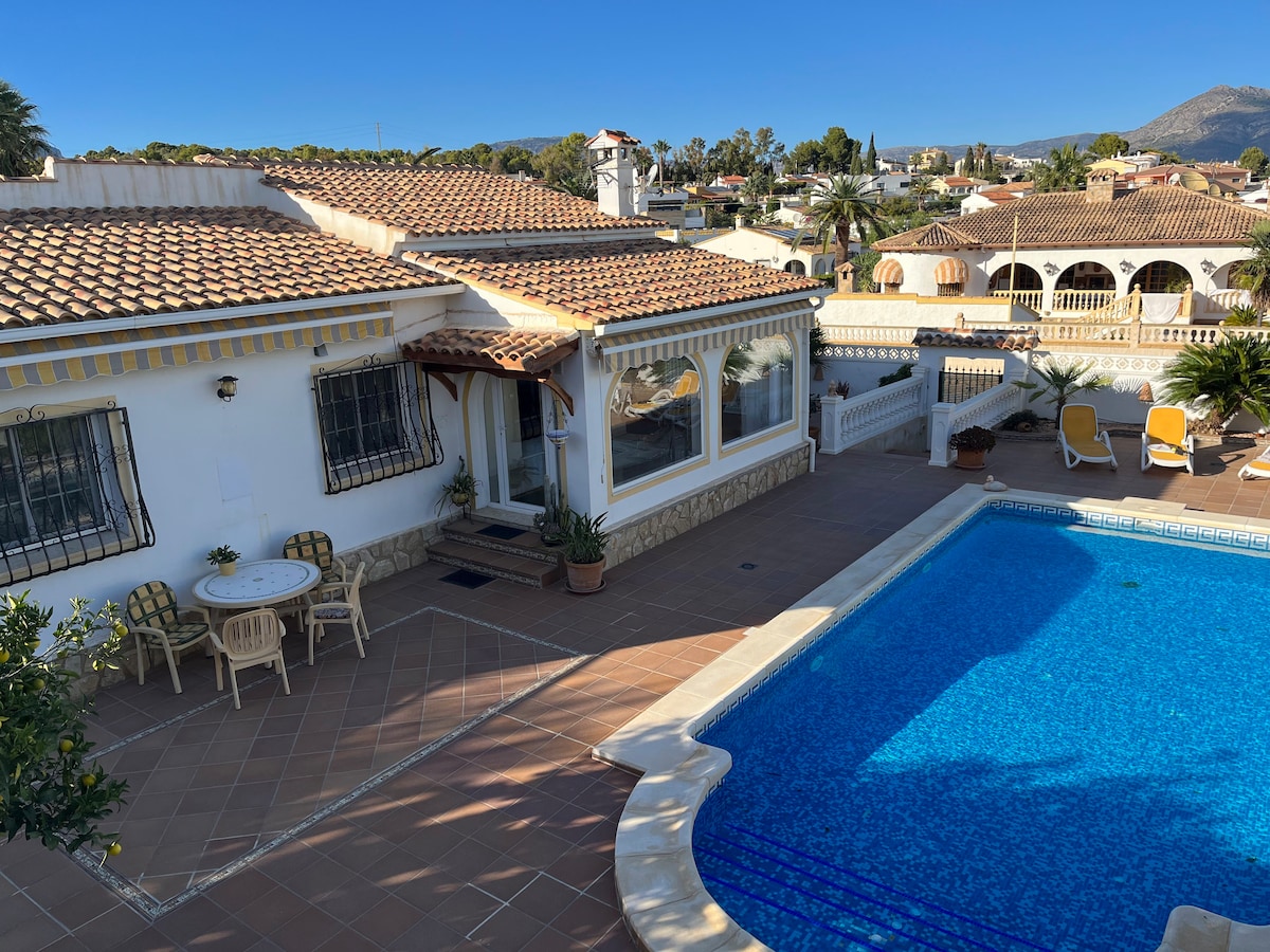 Imeline Vahemere stiilis villa, neli kaheinimesetuba magamistuba, suur privaatne bassein, aed ja suured väliruumid. Asub 2 km kaugusel rannast (6 min autoga) ja 1 km kaugusel Jávea ajaloolisest keskusest. Majas on 3 vannituba, klaasist veranda, klaasist veranda, avar elutuba diivanvoodiga ja 2 kööki. Üks neist asub väljas teisel avatud verandal, kus on grill ja suur laud väljas söömiseks. 📞 Six-Uno-Nueve-Ocho-Cinco-Tres-Dos-Cero-Uno