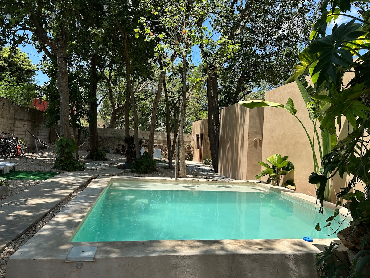 Small and cozy villa with contemporary Mexican design, with everything you need for long and short stays, ideal for resting or home office. Equipped with a full kitchen, living room, bathroom with hot water, air conditioning, fans, high-speed Wi-Fi, private patio with trees, swimming pool and shared laundry within the facilities. Excellent location, a few steps from Paseo Montejo near Walmart, banks, bars and restaurants.