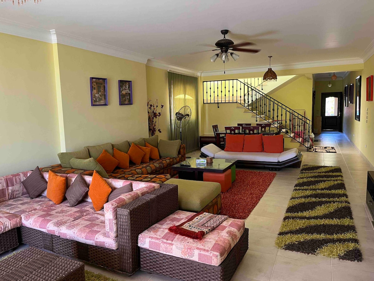 Avar 4BR ridaelamu Mountain View Sokhna 1-s, ideaalne AINULT peredele (kuni 8 täiskasvanut). 2 peamist tuba, 3 vannituba, elutuba nutika teleri ja IPTV-ga, täielikult varustatud köök ja lai aed. Otse basseini ees, soojendatud basseini lähedal, 3-minutilise jalutuskäigu (~300 m) kaugusel rannast. Küla mugavused: Dayra Campi laste mänguväljak, jalgpalliväljak, klubimaja, supermarket, veesport ja jahisadam. AINULT peredele.