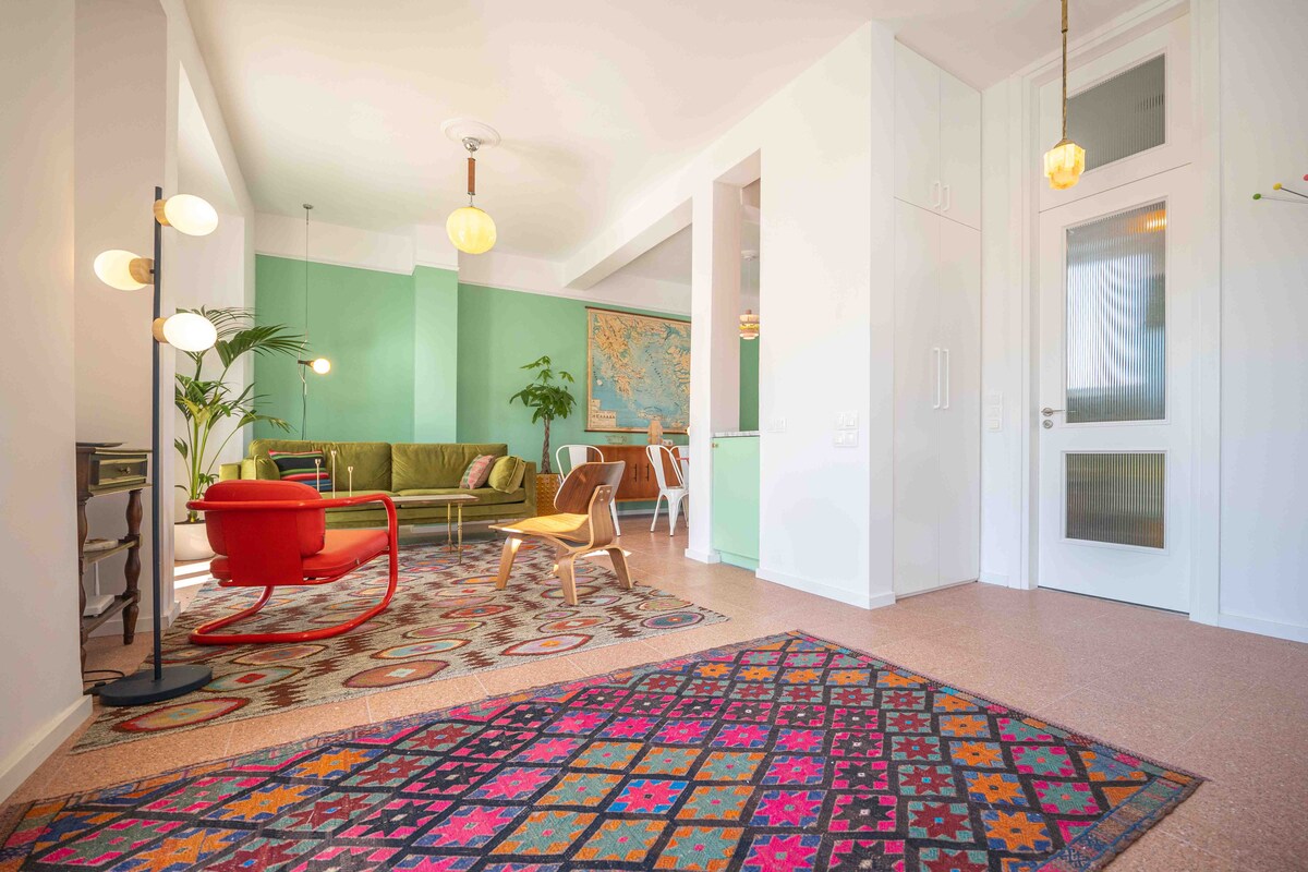 Enjoy an unforgettable experience overlooking the green park. Next to the center of Athens. In the busy square of Agios Thomas, which is 3 minutes away, you will find nice cafes and restaurants. It is a 15-minute walk from the bus stop for the airport and twelve minutes from the M.Mousikis metro station, to reach every corner of Athens. A bus stop is a minute away to go to the center of Athens. In the most central part of the area with access to transport, local market, supermarkets, bakery.