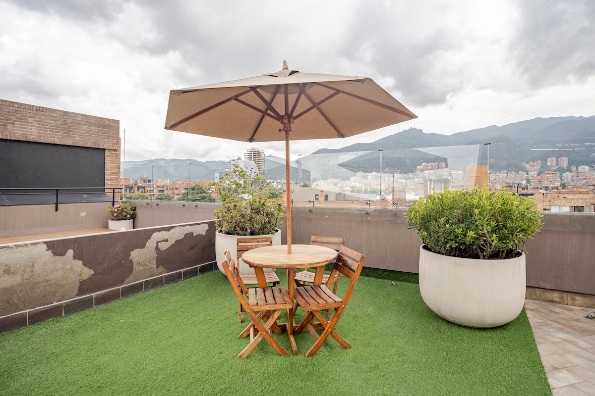 Lõõgastu moodsas ja hubases pööningukorteris, mis on laitmatult puhas ja varustatud kõigega, mida vajad, et end koduselt tunda. Seal on kiire WiFi, täielikult varustatud köök ja väga mugav voodi, mis sobib ideaalselt lühikeseks või pikaks peatumiseks. Hoones on jagatud katuseterrass linnavaatega, ühiskasutatavad tööruumid ja ööpäevaringselt avatud vastuvõtt. Asub Chapineros, Bogotá keskses ja hästi ühendatud piirkonnas. Leiad suurepäraseid kohvikuid ja restorane. Tähelepanelik ja sõbralik suhtlus kogu sinu siinviibimise ajal.