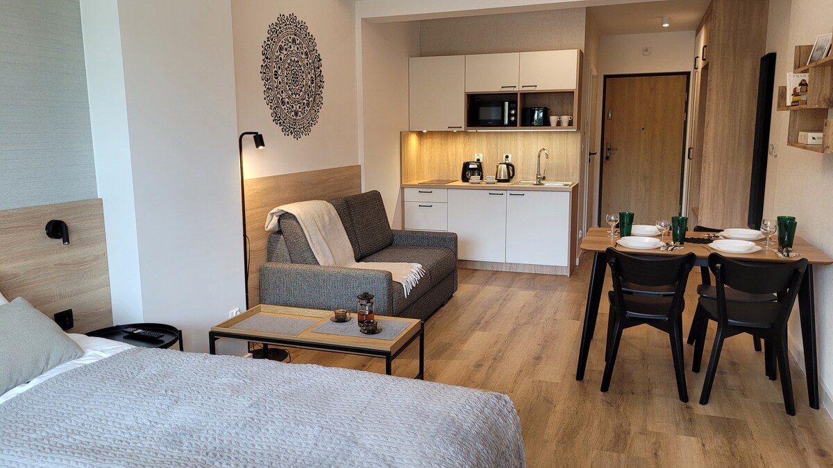 Naudi lõõgastumishetki ilusas, avaras ja mugavalt varustatud korteris. Seal on 160 cm voodi, mis on eraldatud restiga seinaga mugavast kööginurgaga elutoast. Diivanvoodi ja tugitool ( valik 5 inimesele ). Mugav vannituba , kööginurk kohvimasina ja mikrolaineahjuga. Kortermajas on hinnaga saun ja jõusaal. Mõisas on ilus restoran, hommikusöök on saadaval ja järved on 60 m kaugusel. Szczyrk 20 minutit, Żari mägi 20, Żywieci järv 20 meetrit